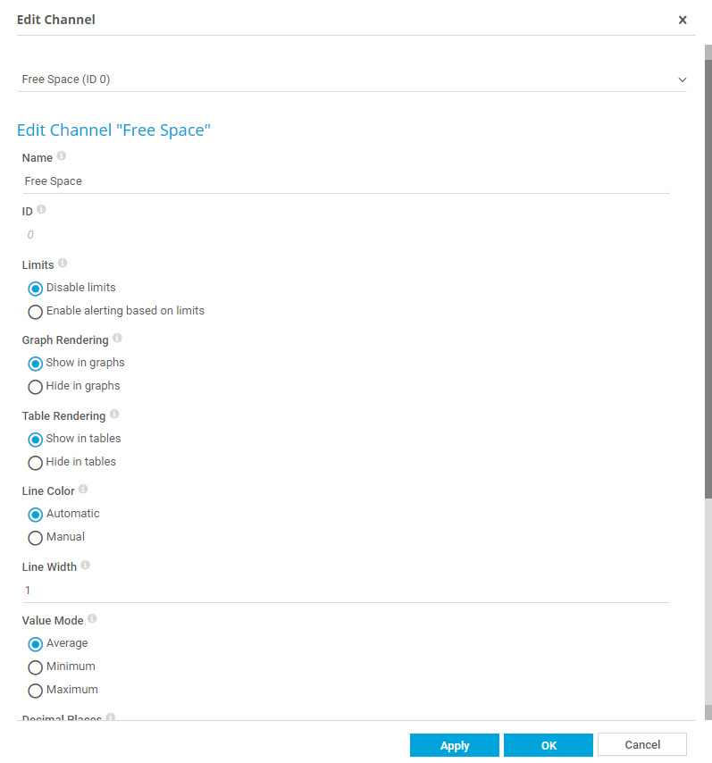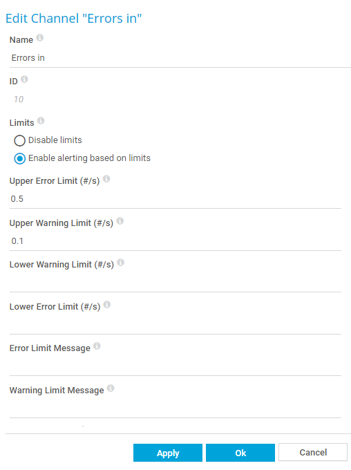 - Enable alerting based on limits: Define limits for the numeric values that are returned by the device. The sensor of which this channel is a part of shows the Warning status or the Down status when limits fall below the defined value or when limits are exceeded.