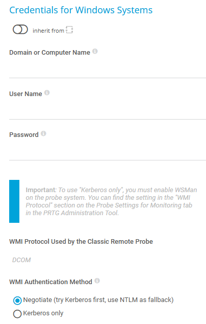The System Information feature is enabled by default. To retrieve the data, PRTG automatically uses the credentials for Windows systems and the credentials for SNMP devices that you entered in the device settings or that the device inherits from a parent object like the root group. Consider this when you monitor devices that are outside of your local network, especially when you use SNMP v1 or SNMP v2c, which do not provide encryption.