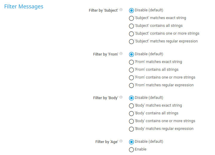 • 'Subject' matches regular expression: Filter emails whose 'Subject' field matches the defined regular expression.