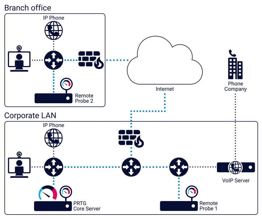 The QoS sensors measure the quality of service by sending UDP packets between two probes. This means that you can test any network connection in your network by placing a remote probe on (or near) each end of the connection and measuring the connection quality between them. This way, you can find network issues that can affect VoIP sound quality or cause video streaming issues.