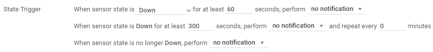 Enter the time in seconds that PRTG waits before it sends a notification (latency). This can avoid false alarms if, for example, a sensor changes to the Down status for only a few seconds. Enter an integer.