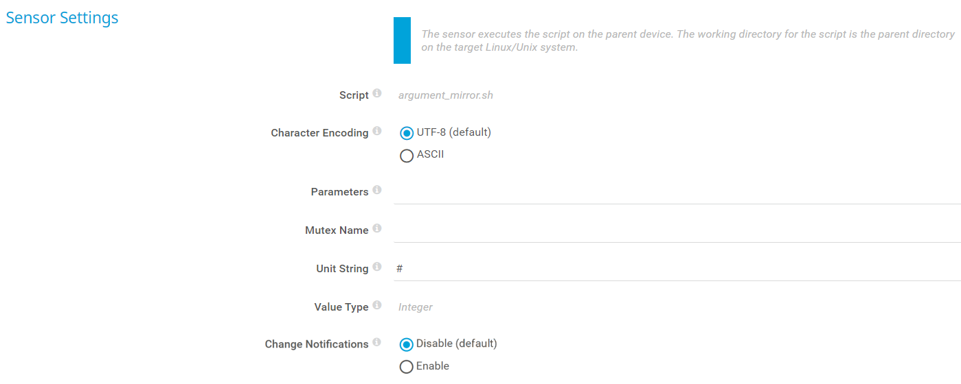 Select a script file from the dropdown list. It shows all script files that are available in the /var/prtg/scripts directory on the target Linux/Unix system. For a script file to appear in this list, store the target file in this directory.