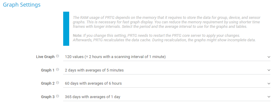 PRTG shows several graphs on the Overview tabs and x Days tabs of objects in the PRTG web interface. PRTG keeps these in RAM for fast graph display. The longer the time frames and the shorter the intervals are, the more memory PRTG uses for this. You can adapt the details for all four graphs. This setting also changes the caption of the graphs and tabs in the PRTG web interface and thePRTG app for desktop.