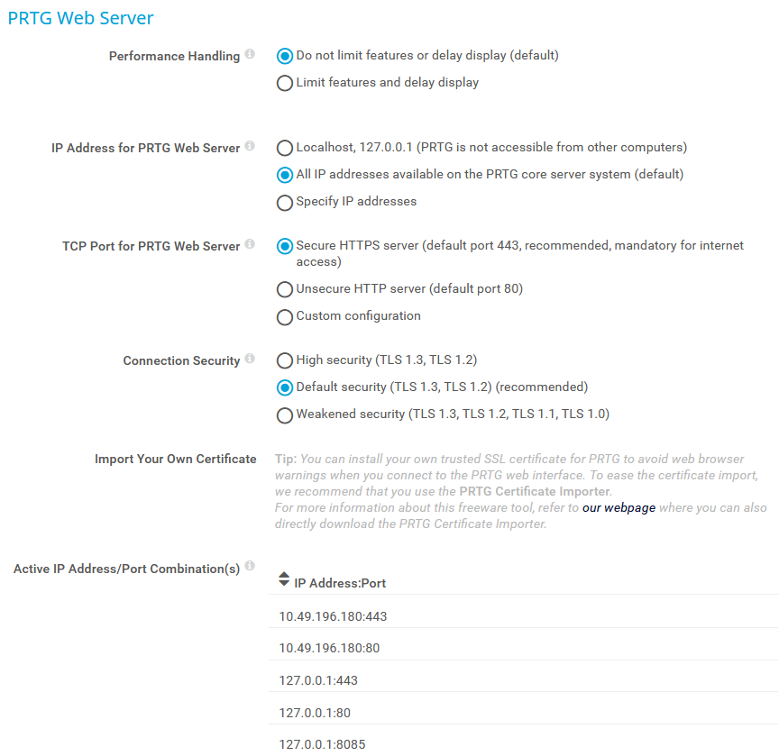 Shows all active combinations of the IP addresses and ports on which the PRTG web server listens for web requests.