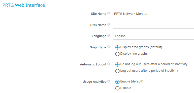 Enter a Domain Name System (DNS) name if the PRTG web interface is also reachable via the DNS name. PRTG also uses the DNS name in notification emails to generate links by default. Enter a string.